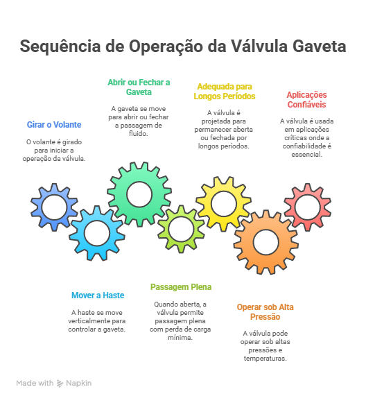 O princípio da válvula gaveta funcionamento é simples, porém eficaz. Ao girar o volante, a haste move verticalmente uma gaveta — ou obturador — que abre ou bloqueia completamente a passagem de fluido.